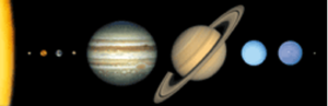 This illustration shows the approximate sizes of the planets relative to each other. Outward from the Sun, the planets are Mercury, Venus, Earth, Mars, Jupiter, Saturn, Uranus, Neptune, and Pluto. The largest Jupiter’s diameter is about 11 times that of the Earth’s and the Sun’s diameter is about 10 times Jupiter’s. The smallest Pluto’s diameter is slightly less than one-fifth of Earth’s. The planets are not shown at the correct distance from the Sun.